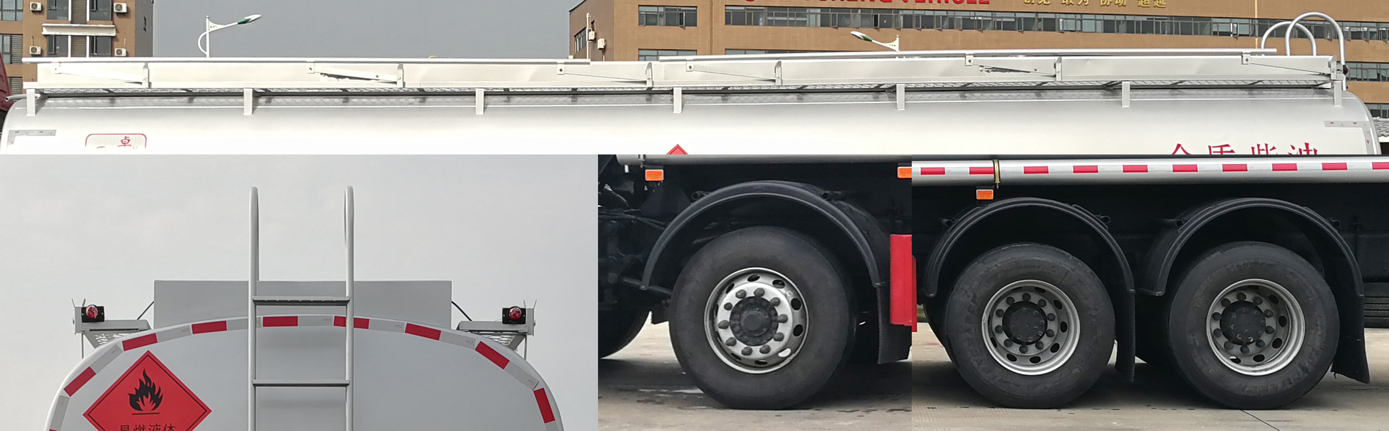 該車為危險貨物運輸車,運送危險貨物車輛類型為:FL型,類項號:3。運輸介質:汽油,罐體有效容積27.5立方米,罐體外形尺寸(長×寬×高)(mm):8900×2300×1660。僅選用軸距(mm):1800+4575+1400。側、后防護材料均為Q235,螺栓連接,后防護截面尺寸(mm)80×140,下邊緣離地高460mm。隨底盤選裝駕駛室。僅選用排氣管前置、限速裝置(限速80km/h)、前輪盤式制動及子午線輪胎的底盤。轉向輪安裝輪胎爆胎應急防護裝置。后軸采用空氣懸架。安裝帶有衛星定位功能的行駛記錄儀。EBS**系統型號/生產廠家:EBS3/威伯科(上海)管理有限公司。發動機/油耗值(L/100km)對應關系為:MC07.31-60/38.0,MC07.34-60/38.0,MC09.35-60/38.2,MC09.38-60/38.2,MC09.35B-60/38.2,MC07.33-60/38.0,MC07H.33-60/37.44,MC07H.35-60/37.44,MC11.40-60/37.3,MC11.44-60/37.3,MC11.40-61/37.3,MC11.43-61/37.3,WP8.350E61/38.04。選裝ETC。罐體上部選裝上走道,**軸及驅動軸選裝弧形擋泥板。 |