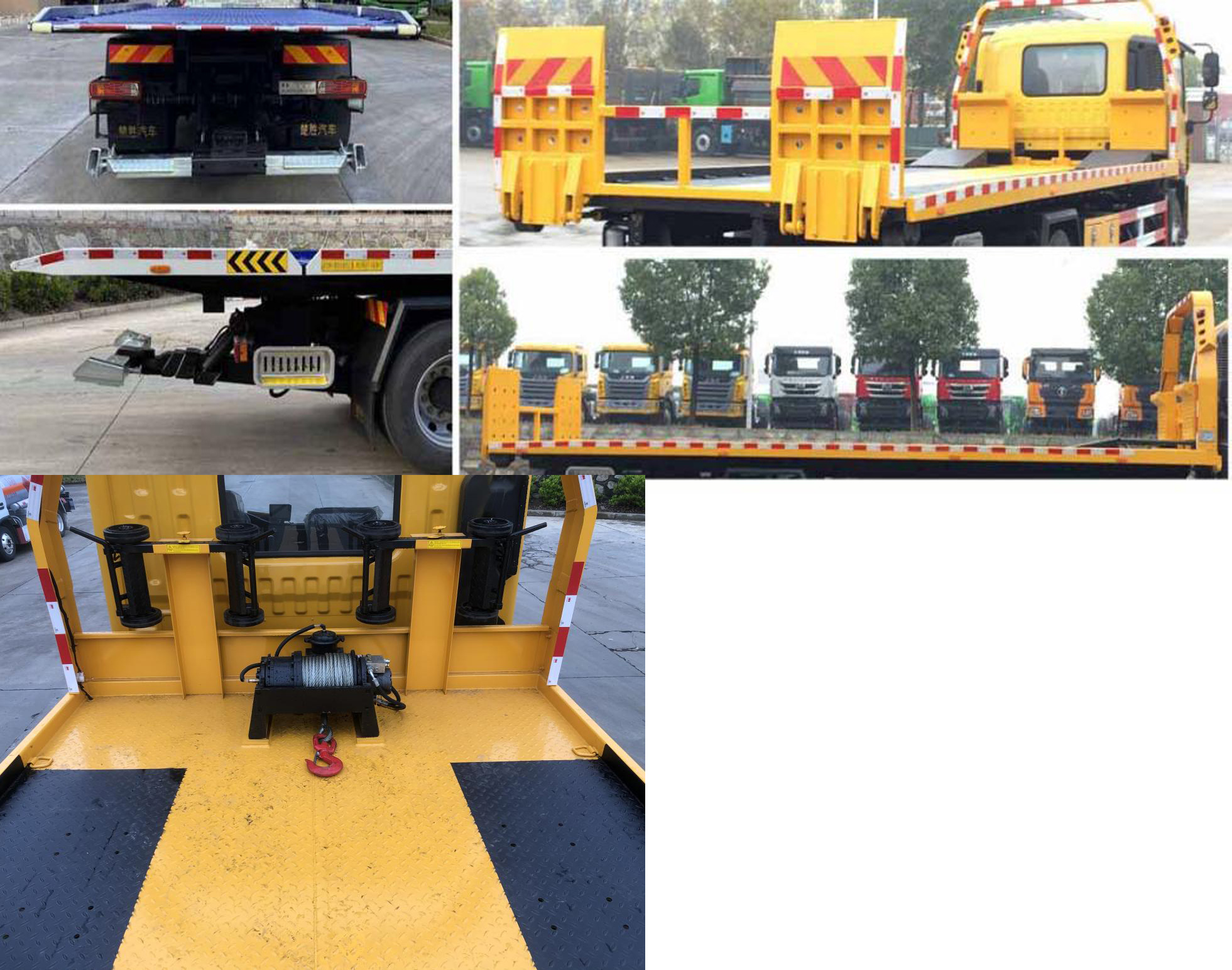 ABS型號:ABS-E,ABS/ASR-24V-4S/4M,CM4XL-4S/4M/廣州瑞立科密汽車電子股份有限公司;ABS生產企業:威伯科汽車**系統(**)有限公司,東科克諾爾商用車制動系統(十堰)有限公司,廣州瑞立科密汽車電子股份有限公司;選裝部件名稱及其相關描述:選裝后部站板及站板樣式,選裝龍門架樣式;所用材料材質、連接方式以及后部防護裝置的主要尺寸參數(斷面尺寸和離地高度):側防護材料采用Q235,螺栓連接;后防護由專用裝置替代,下邊緣離地高490mm;專用功能及裝置描述:該車主要用于道路清障,主要專用裝置為平板、托臂、絞盤、鋼絲繩、油缸;托舉質量(kg):準乘人數2人時,整備質量(kg)/托舉質量(kg)對應關系為:11000/6870,10000/7870,9000/8870;準乘人數3人時,整備質量(kg)/托舉質量(kg)對應關系為:11000/6805,10000/7805,9000/8805;隨底盤選裝駕駛室。選裝平板樣式,托臂樣式。選裝絞盤安裝位置。 |