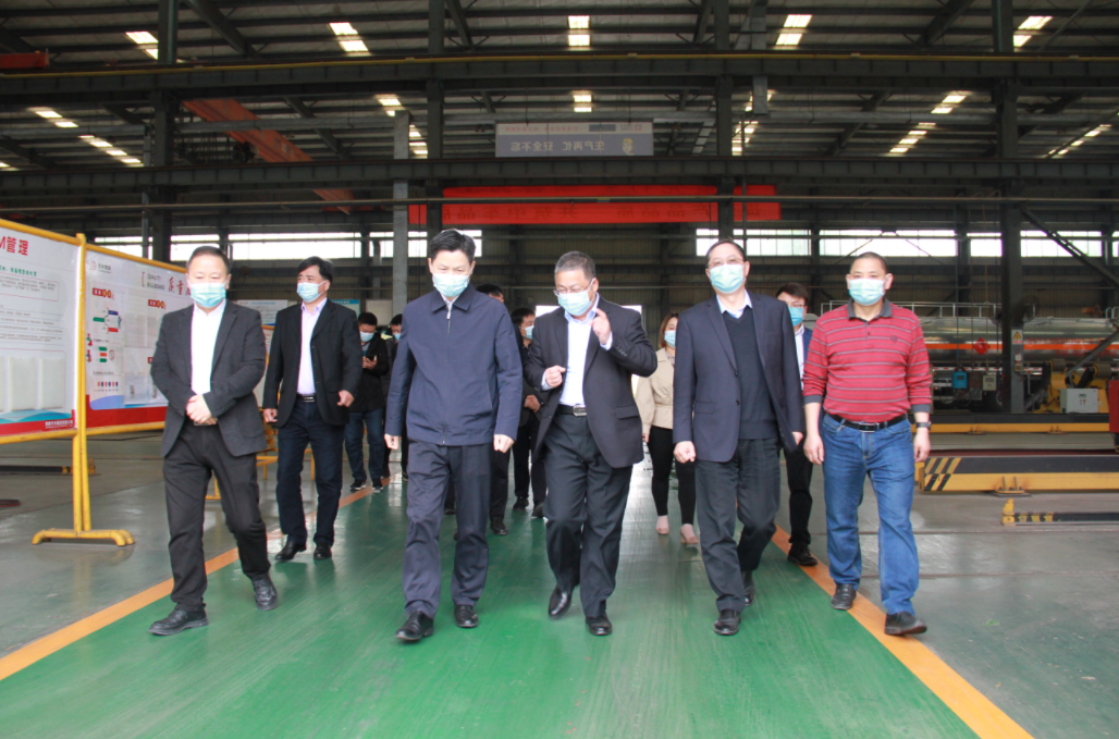 市領導一行參觀了公司的罐式車、自卸車、備料中心等生產車間和正在建設的創新工廠項目。